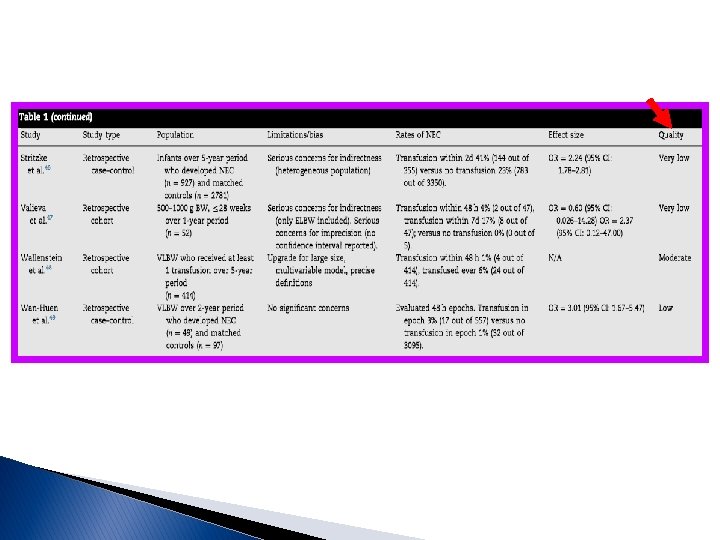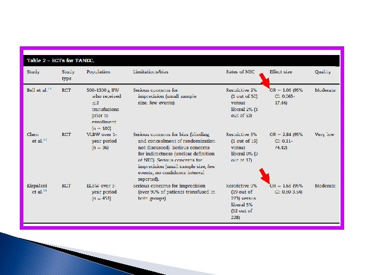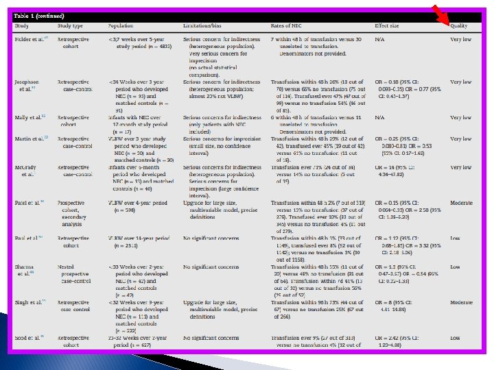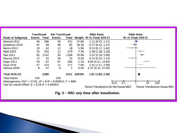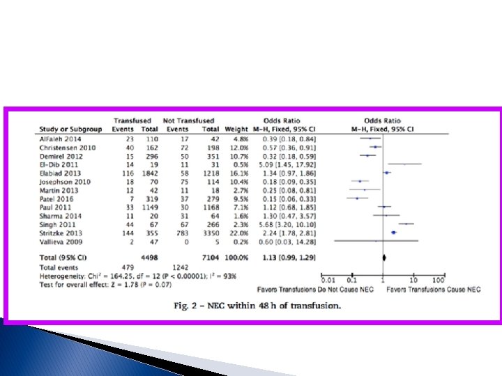 Nos estudos observacionais tanto para ECN dentro de 48 horas ou qualquer tempo depois das transfusões, há substancial heterogeneidade em relação a essa potencial associação [93 e 86%, respectivamente]; nenhum estudo aplicou um ajuste de risco fisiológico no dia, ou antes, da transfusão (ou seja, é possível que as transfusões consequentemente fossem dadas após o desfecho; interessante que os estudos randomizados sugeriram que um limiar de transfusão mais liberal, resultando em mais transfusões, produziu um resultado de menor taxa de ECN, embora estatisticamente não significativo; a ANEMIA ao invés da transfusão É O FATOR DE RISCO PARA A ECN [acredita-se que a anemia grave leve à hipoxia na parede intestinal, deixando o paciente em risco de estresse oxidativo durante a reperfusão aguda]; assim, os autores desse estudo aplicando o GRADE concluem que não há evidências suficientes para apoiar a possível associação entre transfusão e ECN; nos complementos trouxemos mais informações a respeito do papel da ANEMIA e os estudo reforçam que essa desempenha importante fator de risco (chega a aumentar 6 vezes os risco de ECN!); possíveis meios de prevenir a anemia nesses prematuros incluem o CLAMPEAMENTO TARDIO DO CORDÃO E A ORDENHA DO CORDÃO; quanto à SUSPENSÃO DA ALIMENTAÇÃO durante as transfusões: nos alimentados durante a transfusão tem sido mostrado queda significativa da oxigenação mesentérica pós-prandial aumentando o risco de isquemia mesentérica e o desenvolvimento de ECN relacionado à transfusão, principalmente se ANEMIA concomitante, embora precisamos dos resultados de estudos com maior poder em andamento ( embora seja reconhecido a necessidade de mais estudos com maior poder (Ensaio TOP: Transfusions of Prematures: TOP; WHEAT: Withholding Enteral Feeds Around Transfusion); a Iniciativa de melhoria da qualidade para reduzir a taxa de ECN nos prematuros da Rede Vermont contempla a suspensão da dieta DURANTE a transfusão, norma adotada pela Unidade Neonatal do HMIB. . Paulo R. Margotto