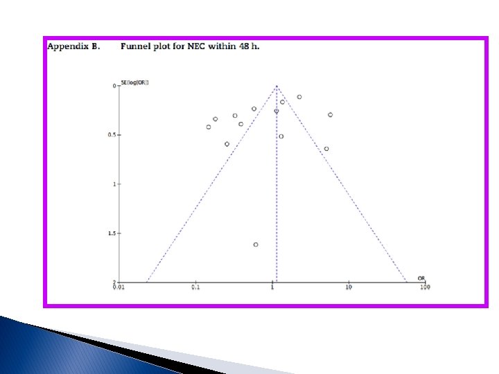 Os dados agrupados ECRs (Fig. 4) carecem dessa heterogeneidade, mas são derivados principalmente de um estudo 1] A combinação de heterogeneidade dentro da falta de consistência da direção dos efeitos leva a uma menor graduação da evidência geral. [8] Nenhum dos estudos contém indicações específicas para transfusão, embora os ECRs tenham especificado os limiares de transfusão entre a transfusão e a NEC. The funnel plot (GRÁFICO DE FUNIL-entenda adiante) para a ocorrência da NEC dentro e 48 horas da transfusão confirma a heterogeneidade observada no forest plot (Apendice B) e mostrar a relativa fraqueza de publicações em área não significante, sugerindo a possibilidade de viés de publicação, fazendo com que os efeitos agrupados possam ser menos acreditados.