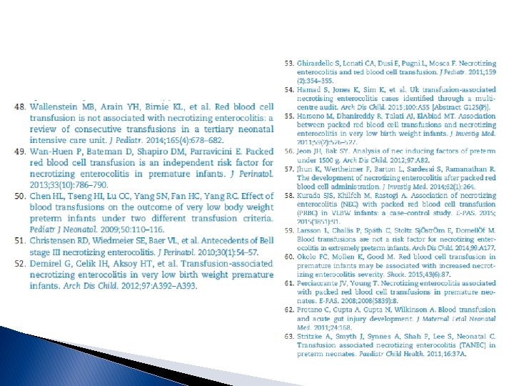 Uma revisão sistemática de sete estudos observacionais relatou que a retenção de alimentos durante a transfusão de hemácias foi associada com menor risco de ECN associada à transfusão (n 7492, RR 0, 47: IC 95% 0, 28 -0, 80, I 2 = 11%) Embora biologicamente plausíveis, os resultados desses estudos observacionais permanecem vulneráveis a viéses e confundidores Um grande estudo controlado randomizado com retenções de alimentos entéricos (Withholding Enteral Feeds Around Transfusion - WHEAT) está atualmente em curso e os autores esperam que forneçam provas para responder à questão clinicamente relevante de que de alimentar durante uma transfusão de hemácias causa ECN.