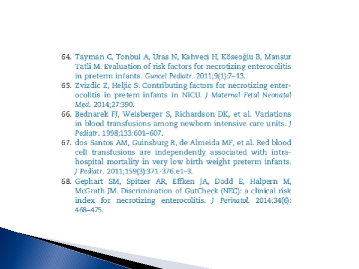 Fatores de risco modificáveis na Enterocolite Necrosante Modifiable Risk Factors in Necrotizing Enterocolitis. Cotten CM. Clin Perinatol. 2019 Mar; 46(1): 129143. doi: 10. 1016/j. clp. 2018. 10. 007. Epub 2018 Dec 21. Review. PMID: 30771814. Similar articles A transfusão nos prematuros extremos e sua associação com ECN constitui um tópico quente entre o neonatologistas, com evidências de estudos de coorte sugerindo associações entre transfusões e ECN nos dias após a transfusão e metanálise de ensaios clínicos de manutenção de altos versos baixos limiares de transfusão, mostrando um forte impacto de mais versos poucas transfusões para manter o hematócrito desejado em ensaios clínicos.