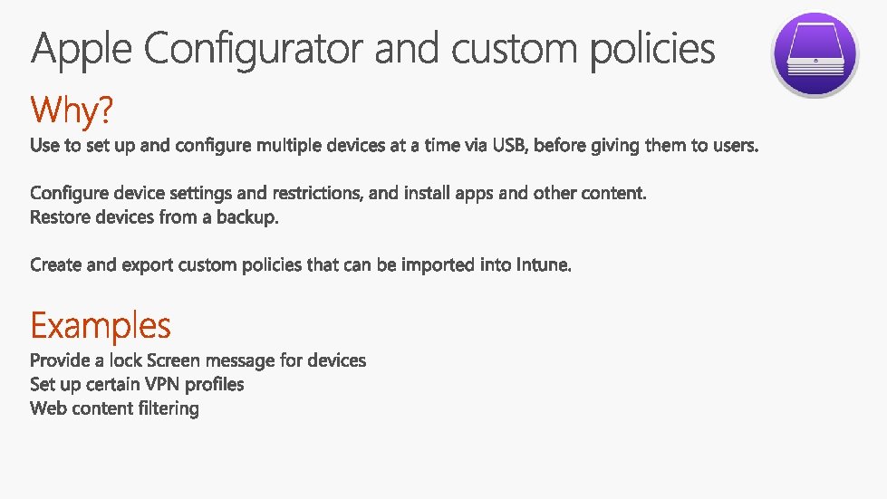 mac. OS Management Secure Web-based enrollment Passcode policies Disk encryption Configure Push Wi-Fi/VPN profiles Push custom policies Push certificates Audit Hardware inventory Software inventory Device reports
