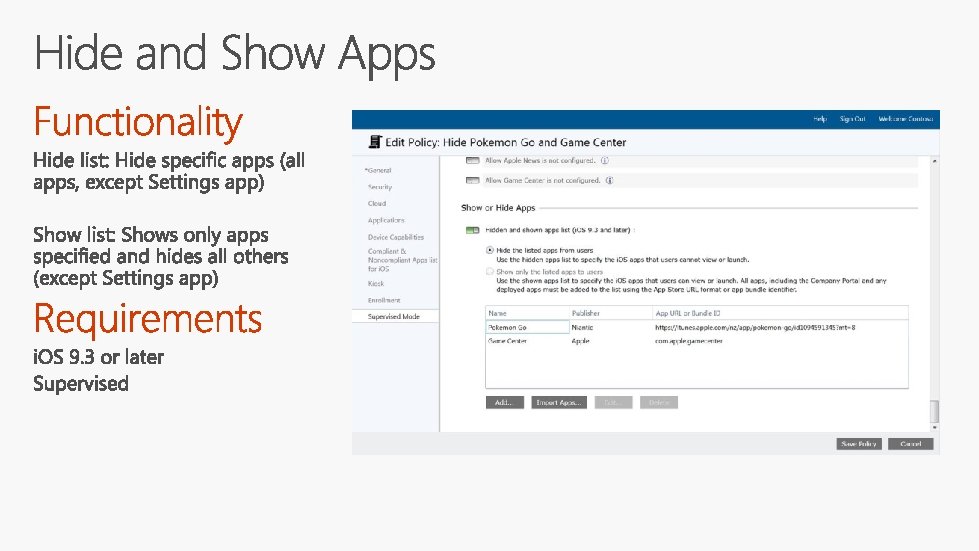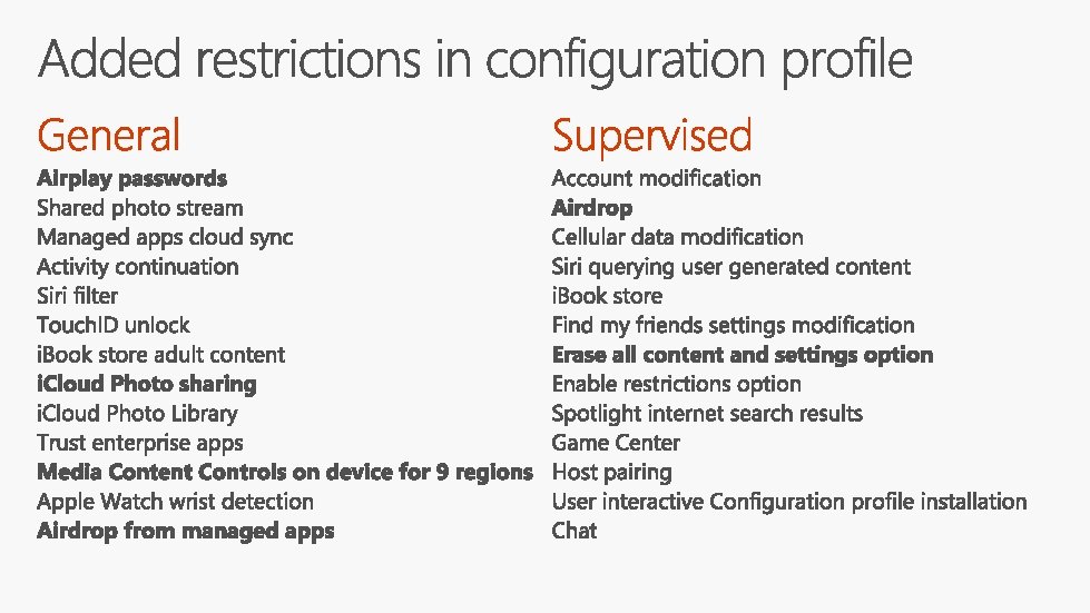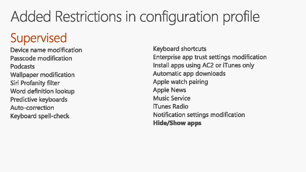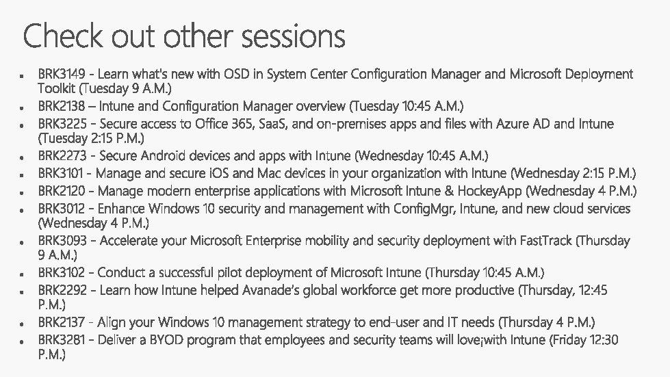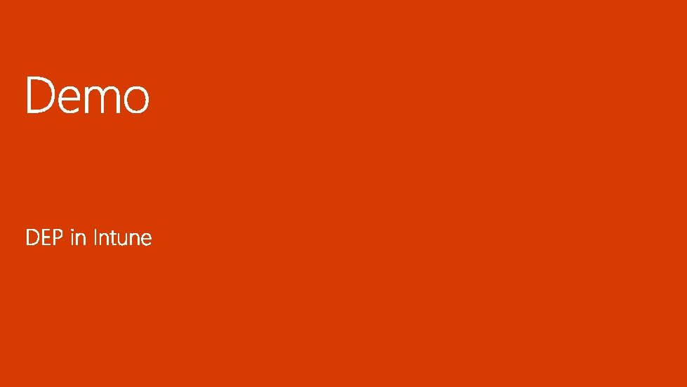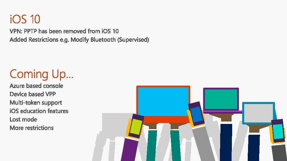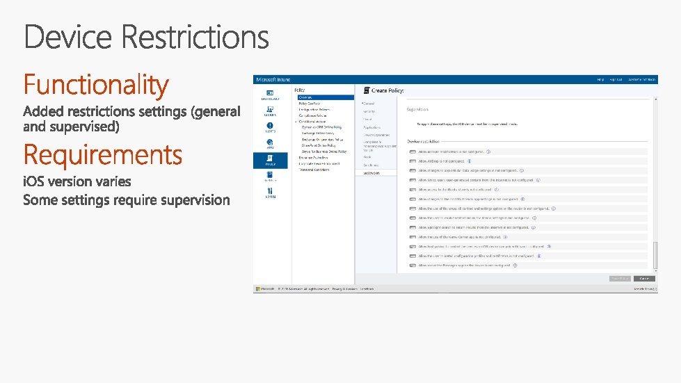 Corporate BYO Full management Lightweight management Examples: kiosk, retail, work device Example: BYOD, Contractors Pre-enroll / out-of-box enrollment (DEP) Supervised Apps deployed via VPP User-less based enrollment Device enrollment manager User-based enrollment + Company Portal Out-of-box enrollment Apply policy + configuration + lock MDM profile to device + enable Supervised mode Install Comp. Portal (user) User-based enrollment via Company Portal Install App Store apps using Apple ID Conditional Access/Compliance More App based management Users brings device Install Comp. Portal + Enroll Apply policy + configuration + jailbreak detection + AAD device registration + SSO and selective wipe with managed apps