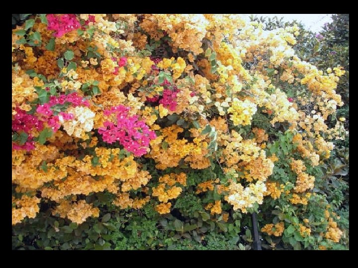Une touriste devant un beau mur de bougainvillées.