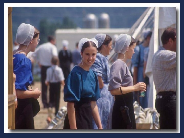 Les Amish sont regroupés en petites communautés. Une communauté regroupe environ 35 à 40 familles, soit 250 à 300 personnes, sous l'autorité d'un patriarche. Un espace géographique de petite taille favorise la cohésion du groupe. Dans chaque ferme vivent ensemble quatre à cinq générations: des petitsenfants aux arrière-grands-parents. Chaque couple a en moyenne 10 enfants.