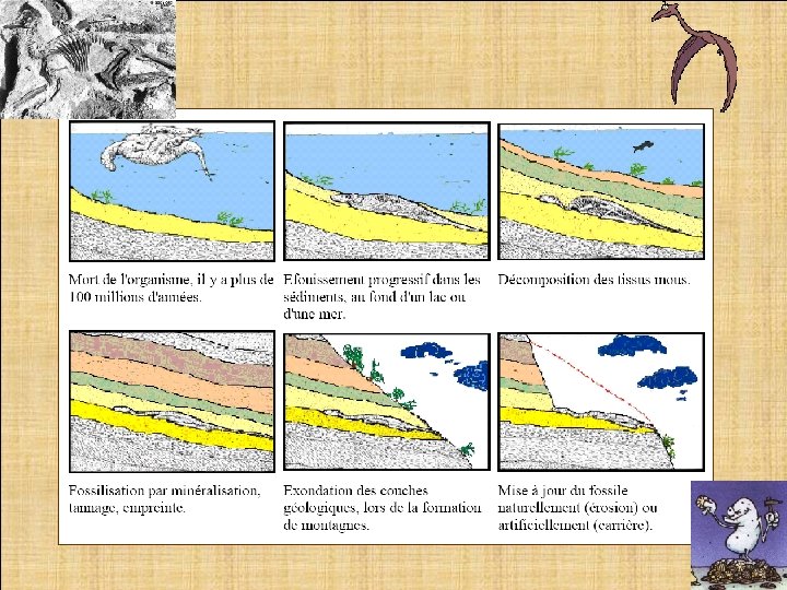 Processus de fossilisation : Pour qu'il y ait fossilisation, il faut que l'animal ou le végétal, soit soumis à des conditions particulières peu de temps après sa mort et avant la décomposition par les bactéries. Les organismes ont été protégés par un enfouissement rapide dans des sédiments, (Argiles ou Sables), de la résine (ambre), des glaces, des tourbes, des sels et des cendres volcaniques.