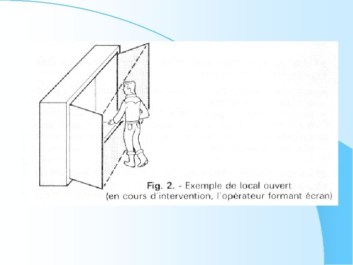 6. 4. 2. - Travaux d'ordre électrique Lorsqu'au cours d'un travail, une personne est amenée à supprimer une protection contre les contacts directs (par exemple ouverture d'une armoire contenant du matériel électrique), des pièces nues du domaine BT devenant alors accessibles, un balisage doit être effectué pour interdire l’accès de celles pour lesquelles la personne elle-même ne fait pas écran (voir planche n° 2, ci-après).