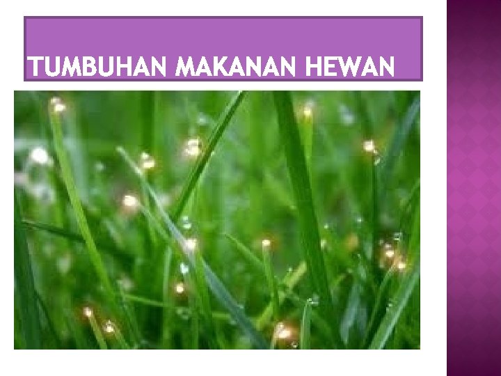 Ada jenis hewan yang makan tumbuh-tumbuhan. Tumbuhan yang menjadi makanan hewan itu biasanya berupa rumput, buah-buahan, dan biji-bijian. � a. Rumput � Beberpaa hewan memakan rumput dan daun-daun segar. Misalya rumput gajah, daun pisang, daun jagung, daun tebu. Hewan yang makan rumput dan daun-daun segar misalnya sapi, kerbau, kambing, dan kelinci. � b. Buah-buahan � Buah-buahan yang menjadi makanan hewan misalnya mangga, jambu, pisang, dan kersen. Hewan yang makan buah-buahan misalnya kera dan bangsa burung. � c. Biji-bijian � Biji-bijian yang menjadi makanan hewan misalnya padi, jagung, dan kacang. Hewan yang makan bijian misalnya beberapa bangsa burung. �