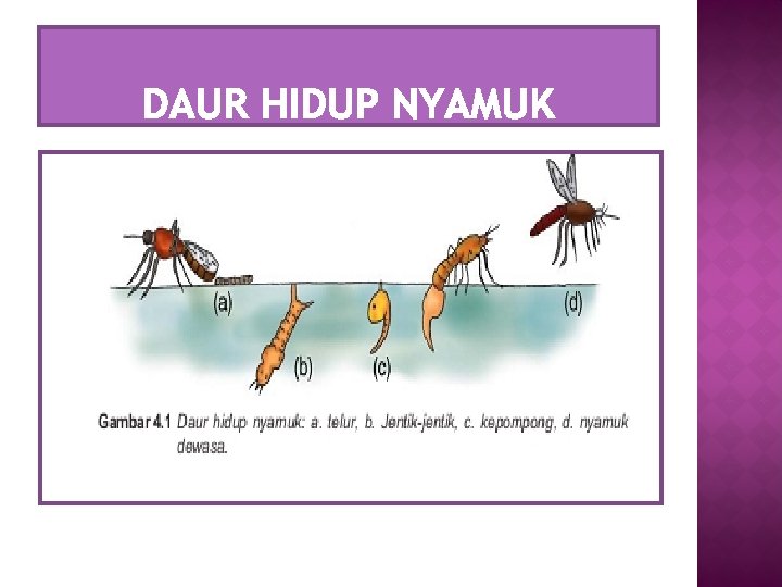 Jika nyamuk betina bertelur, Ø Telur nyamuk menetas menjadi jentik-jentik. Ø Jentik-jentik berubah menjadi kepompong. Ø Kepompong berubah bentuk menjadi nyamuk muda, dan Ø kemudian menjadi nyamuk dewasa. Karena perubahan bentuknya mengalami tahap kepompong, maka nyamuk dikatakan mengalami metamorfosis sempurna