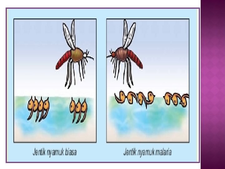 Pernahkah kamu memperhatikan saat nyamuk hinggap di dinding? Nyamuk ada yang hinggap menungging dan ada yang sejajar dengan dinding. Nyamuk yang hinggap menungging adalah nyamuk malaria. Jentik-jentik nyamuk malaria sejajar dengan permukaan air, Sedangkan jentik-jentik nyamuk biasa menggantung di permukaan air.