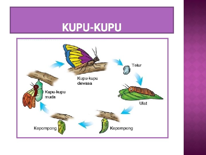 Coba kamu perhatikan kupu-kupu yang hinggap di bunga! Ø Ø Ø Ketika kupu-kupu dewasa bertelur, telurnya akan menetas menjadi larva yang berbentuk ulat. Ulat menjadi kepompong dan Kepompong kemudian berubah menjadi kupu dewasa. Seperti pada nyamuk, Kupu-kupu mengalami tahap kepompong sehingga dikatakan kupu-kupu melakukan metamorfosis sempurna