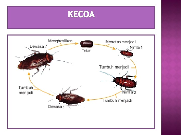 Kecoa atau lipas betina bertelur dalam jumlah banyak yang diletakkan di permukaan tanah atau pada tumpukan sampah. Telur kecoa menetas menjadi anak kecoa yang disebut nimfa. Nimfa memiliki bentuk yang mirip dengan induknya. Kemudian nimfa menjadi kecoa dewasa. Karena perubahan bentuknya tidak mengalami tahap kepompong, maka kecoa disebut mengalami metamorfosis tidak sempurna. Serangga lain yang mengalami metamorfosis tidak sempurna antara lain rayap, belalang, dan walang sangit.