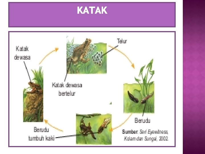 Katak merupakan hewan yang mengalami metamor fosis. Mengapa katak mengalami meta mor-fosis? Katak memiliki tahap pertumbuhan pada katak muda yang berbeda dengan katak dewasa. Menjelang dewasa, berudu mulai tumbuh kaki dan masih berekor, serta masih hidup di air. Setelah dewasa, kaki katak tumbuh sempurna dan ekor pun menyusut hingga tidak memiliki ekor lagi. Pada tahap katak dewasa, katak lebih sering berada di darat dan kembali lagi ke air untuk bertelur