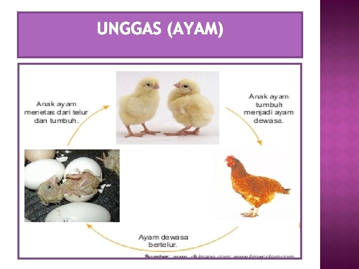 Ayam adalah hewan yang berkembang biak dengan cara bertelur. Dalam telur ini, anak ayam tumbuh hingga siap keluar dari telur dan dapat hidup di alam bebas. Pada awalnya ayam dewasa bertelur, jika dierami, telur-telur ayam tersebut akan menetas mengeluarkan anak ayam. Anak ayam akan tumbuh dan berkembang menjadi ayam dewasa