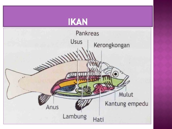 Ikan hidup di dalam air. ikan bernafas dengan insang , seperti manusia ikan perlu oksigen untuk brnafas namun ikan tidak menghirupnya dari udara, namun menyerapnya dari air. Air masuk melelui mulut lalu melewati insang. Kemudian oksigen di dalam air pindah ke pembuluh darah di insang. Ikan bernafas dengan insang yang berjumlah 4 pasang. insang terletak di sebelah kanan dan kiri kepala. Insang di lindungi oleh tutup insang. Saat mulut terbuka, air masuk melalu irongga mulut, sementara itu t 6 utup insang mengantup (menutup). Kemudian oksigen yang terkandung di dalam air di ikat oleh kapiler darah, sebaliknya karbon dioksida di keluarkan melalui insang.