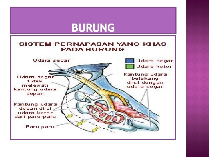 Tahu kah kamu ? ? ? Ketika burung mengepakan sayap nya, burung tidak memasukan udara melalui hidung. Pernafasan burung saat terbang berasal dari udara yang tersimpan di dalam pundi-pundi udara. Pada waktu tidak mengepakan sayap (melayang), burung kembali mengisi pundi-pundi udaranya dengan udara. Demikian pula saat burung hinggap di suatu tempat sisa pernapasan akan keluar melalui hidung.