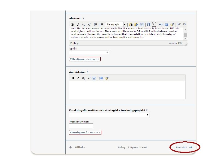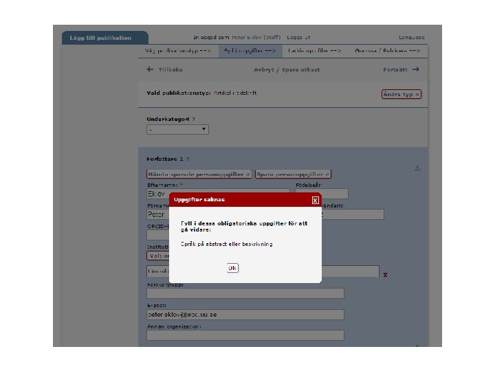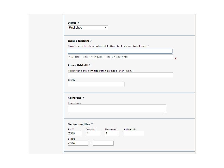 Obligatoriska fält (artikel) • • Författare (efternamn, förnamn) Titel Språk titel Typ av innehåll (t. ex. refereegranskad) Ingår i tidskrift (om ”publicerad) År Nationell ämneskategori Språk abstract (om abstract finns)