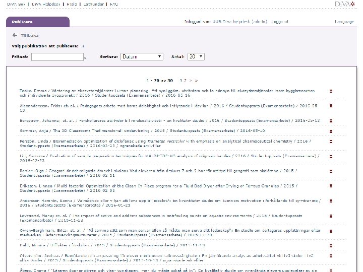 Publikationsflödet i Di. VA Bibliografisk granskning i efterhand - Referenser publiceras direkt Publikationer med fulltexter Avhandlingar och studentuppsatser Möjligt att låsa poster när bibliografisk granskning är klar
