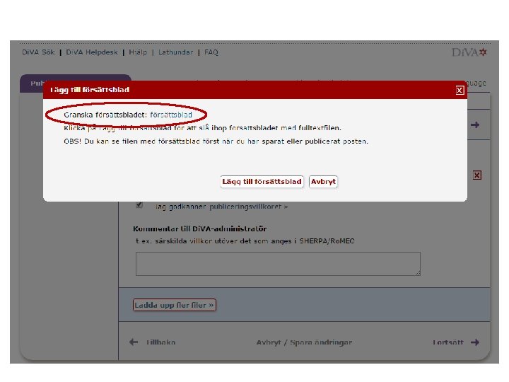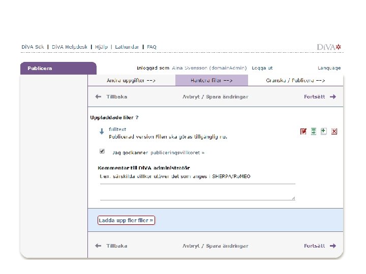 Behörigheter i Di. VA • Staff (forskare/anställda) – kan registrera och importera poster och i vissa fall ändra i egna poster • Student – kan enbart registrera studentuppsatser • Domain. Admin (bibliotekarie/motsvarande) – behörighet att administrera användare och grupper på lärosätesnivå • Admin – behörighet att hantera publikationer enligt tilldelad roll (tilldelas av domain. Admin)