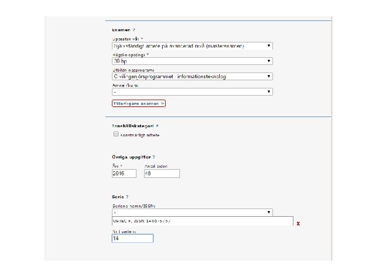 Obligatoriska fält (examensarbete) • • Författare (efternamn, förnamn) Titel Språk titel Uppsatsnivå Högskolepoäng År Nationell ämneskategori Språk abstract (om abstract finns)