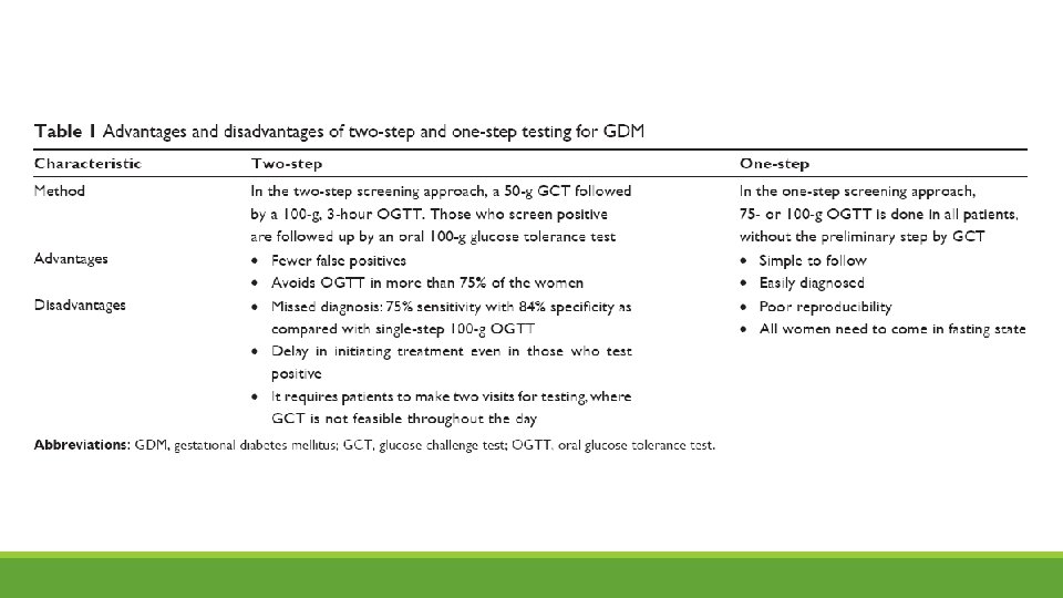 2 Step Testing: most widely used in US • First step identifies those at increased risk for GDM. • Second step (diagnostic test) limited to those at increased risk • 24 -28 weeks gestation Step 1. ◦ 1 hour 50 gram glucose challenge ◦ No fasting necessary ◦ >140 identifies 80% of women with GDM, >130 identifies 90% women with GDM Step 2. ◦ 3 hour 100 gram GTT ◦ Overnight fast ◦ Women with 1 abnormal value at increased risk for poor outcomes