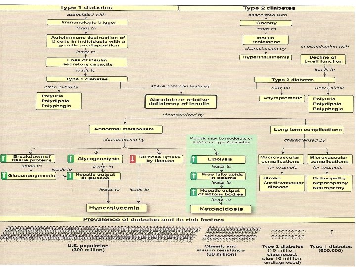 B. Metabolic changes in Type 1 diabetes • The metabolic abnormalities of diabetes mellitus result from a deficiency of insulin which deeply affects metabolism in three tissues: liver, muscle, and adipose tissue 1. Hyperglycemia and ketoacidosis: • Elevated levels of blood glucose and ketones are the feature of untreated Type 1 diabetes mellitus. • Hyperglycemia is caused by ↑hepatic production of glucose + diminished peripheral utilization.