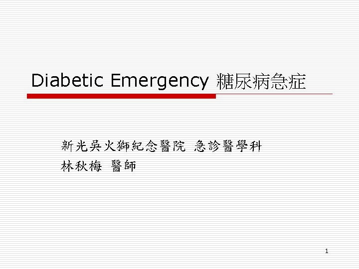 Diabetic Emergency o o o Types of diabetes mellitus History: occur, clinical course, therapy Duration of diabetes Diabetes care Clinical manifestation Others Chiu-Mei Lin 2005 -10 -07 4