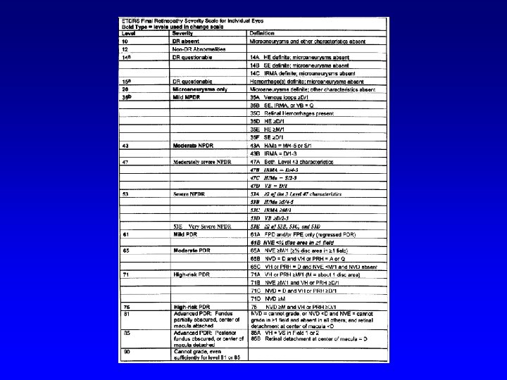 Proliferative DR (PDR) • • • Light Intermediate Fully advanced VH- vitreous hemorrhage, PRHpreretinal hemorhage, TRD- retinal detachment at center of macula
