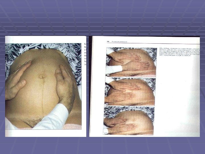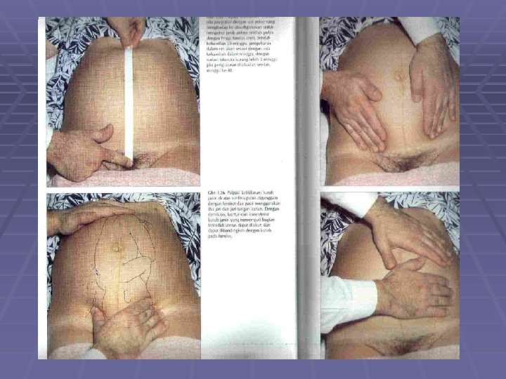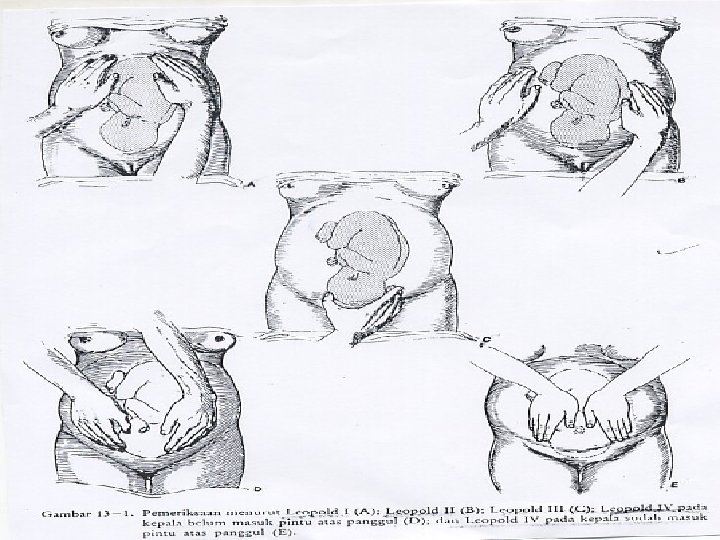 PEMERIKSAAN LUAR ABDOMEN • Leopold I : jari meraba fundus uteri untuk menentukan tinggi fundus uteri, & bag. Apa yg tdpt pd fundus • Leopold II : kedua telapak tangan diletakkan dikedua sisi perut ibu jika fetus situs memanjang maka bagian punggung teraba tahanan yang keras dan yang lain bagian kecil, jika melintang ke 2 bagian tsb diatas tdk ada • Leopold III : ibu jari dan salah satu jari tangan kanan memegang sop untuk mengetahui bagian apa dari fetus yang berada di bawah • Leopold IV : seperti leopold II hanya pemeriksa membelakangi ibu : kedua tangan pada sisi perut ibu untuk menentukan apakah bagian terbawah sudah masuk rongga panggul