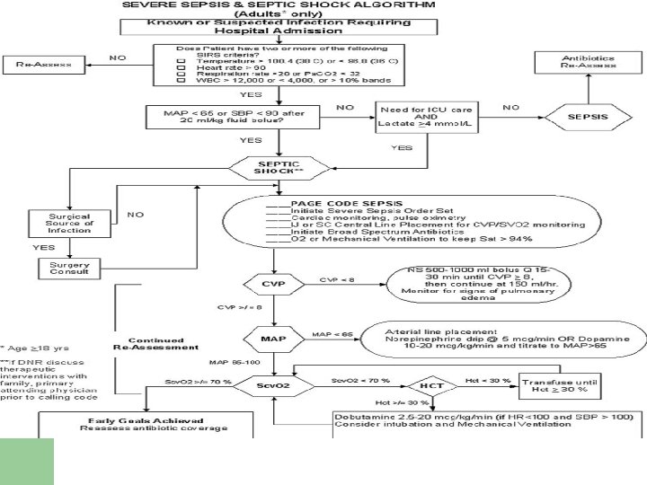 l Restoration of adequate perfusion, monitoring and comprehensive supportive care. Interventions to restore perfusion center on achieving an adequate BP, increasing cardiac output and optimizing oxygen content of the blood (goal directed therapy). l Oxygen demand should also be reduced. l * Most important is 1 - Brain , 2 - Heart and 3 - Diaphragm which take 30% of oxygen found in blood , mechanical ventilation in all this you should decrease demand. * Hyperdynamic state : Thryrotoxicosis , Anemia , Fever and late term pregnancy.