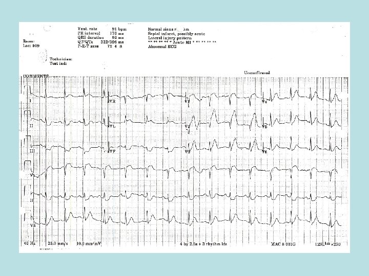 Management Of STEMI Positive stress test indicative of sever CAD: New ST-segment depression at start of exercise, New ST-segment depression>2 mm in multiple leads. Inability to exercise for>2 min. Depressed systolic BP with exercise, Development of heart failure or sustained ventricular arrhythmia. Prolonged interval after exercise cessation (>5 min) before ischemic ST changes return to baseline.