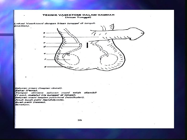 Informasi sebelum tindakan 1. Terangkan macam kontrasepsi keuntungan dan kekurangan masing 2 nya. n 2. Terangkan bahwa vasektomi adalah suatu pembehan n 3. Terangkan bahwa vasektomi ini dianggap permanen. n 4. Beri kesempatan akseptor untuk berfikir. n 45