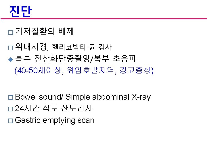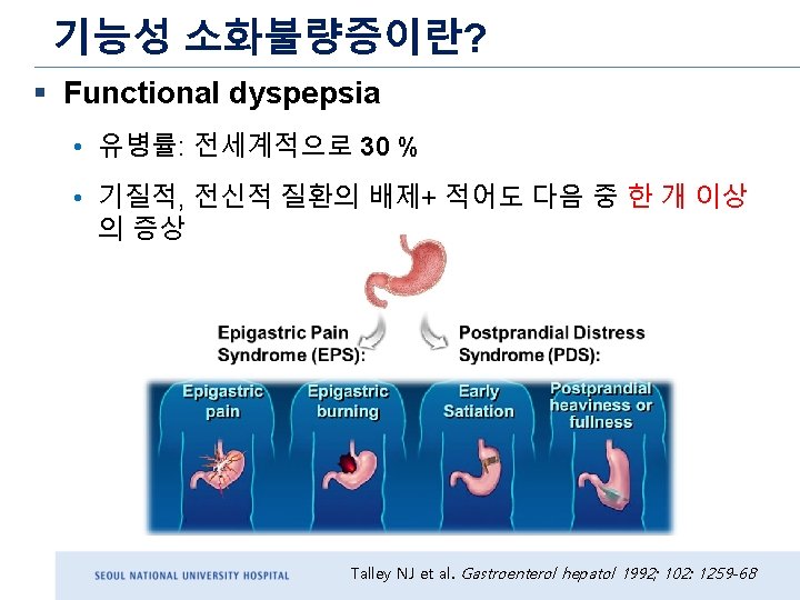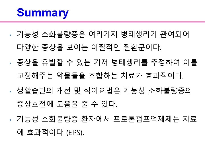 Diagnostic criteria A full 10 years after Rome III, Rome IV is published in 2016 : Severity should be at least sufficient to identify symptoms as “bothersome, ” which should be clinically defined as “severe enough to impact on usual activities. Rome III Rome IV Must include 1. One or more of : 1. One or more of the following : a. Bothersome postprandial fullness b. Early satiation b. Bothersome early satiation c. Epigastric pain c. Bothersome epigastric pain d. Epigastric burning d. Bothersome epigastric burning AND 2. No evidence of structural disease (including at upper endoscopy) that is likely to explain the symptoms *Must fulfill criteria for PDS and/or EPS *Criteria fulfilled for the last 3 months with symptom onset at least 6 months before diagnosis