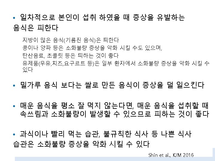 Dietary modification � Small, frequent meals � Reduce dietary lipid � Eliminate problematic proteins: (target wheat) and cow's milk proteins � Try FODMAPs diet