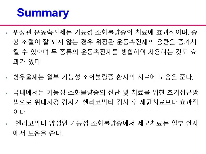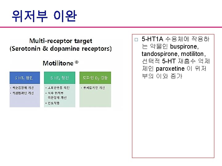 Psychoactive medications SSRIs (ecitalopram) Improved Qo. L with this SSRI Serotonin 5 -HT 1 A receptor agonist (Buspirone) Improved the overall severity of FD symptoms (post-prandial fullness, early satiation, bloating) gastric accommodation↑ (relax the gastric fundus ) TCA (amitriptyline) Post-prandial nausea, adequate symptom relief in patients with ulcer-like FD Mirtazapine Over a placebo, FD with weight loss (appetite↑) Nausea/ vomiting Benzodiazepam (Clotiazepam) Depas (Etizolam) 항불안 효과