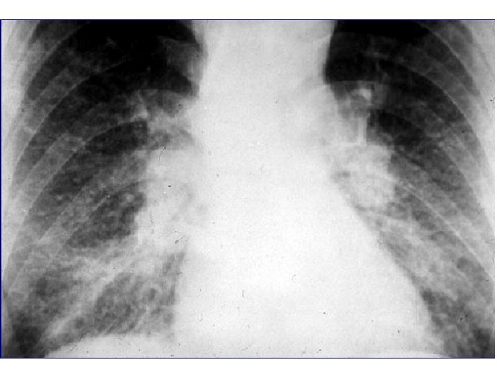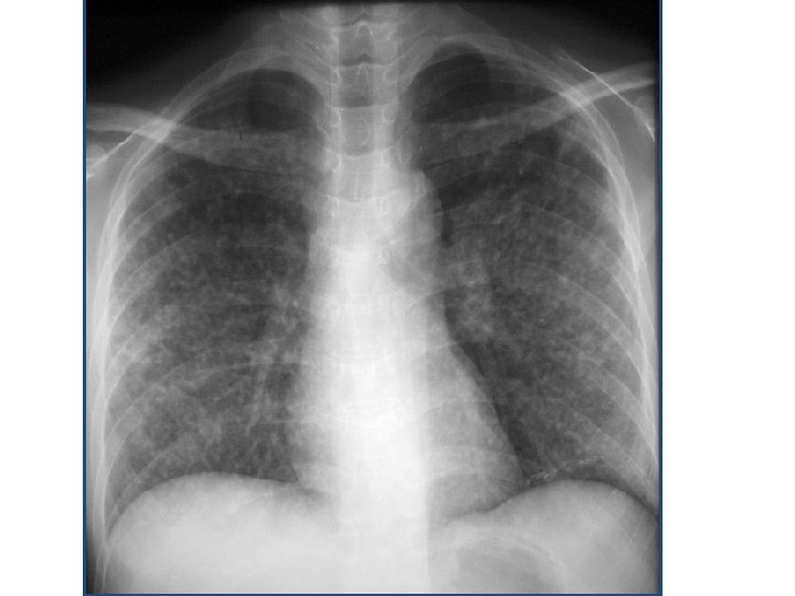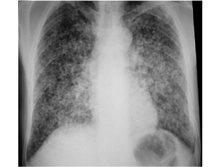 Diagnostic positif : A- Circonstances de découverte : • Examen radiologique systématique. • A la suite d’une symptomatologie respiratoire. • Au cours de l’évolution d’une maladie générale. B- Radiographie de thorax : • La radiographie permet de reconnaitre l’image miliaire par la présence d’un semis d’opacités de 1, 5 à 3 mm de Ø de densité et de répartition variable on distingue 2 types :