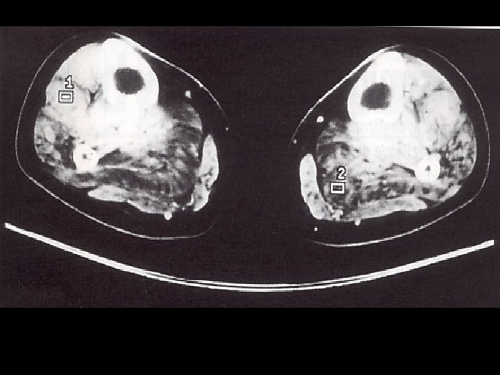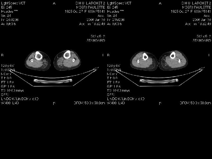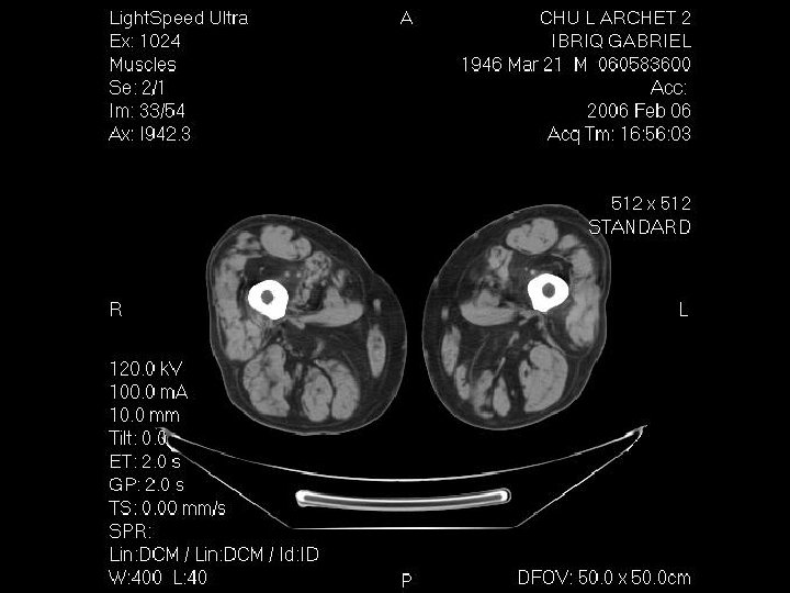 Démarche diagnostic: les examen complementaires Investigation à valeur d’orientation: - Imagerie (scanner, IRM musculaire) Complément indispensable de l’analyse clinique: dépistage atteinte infraclinique, cartographie muscles affectés, préalable à une biopsie IRM si suspicion d’une pathologie inflammatoire; dans les autres cas scanner !!! - Electromyogramme (EMG): Pour évaluer le caractère myogène, recher une myotonie, Stimulation répétitive pour recher une myasthénie etc.