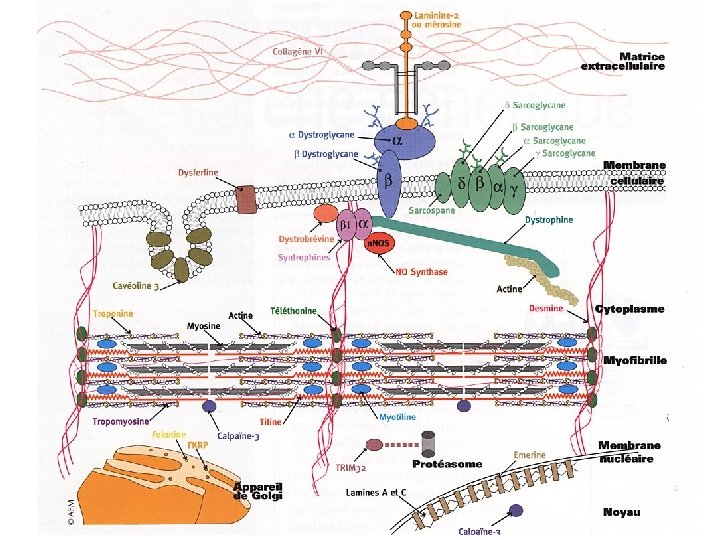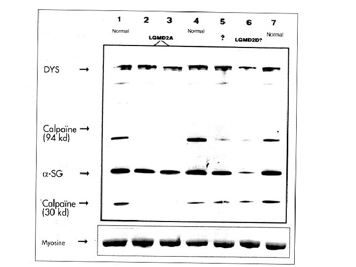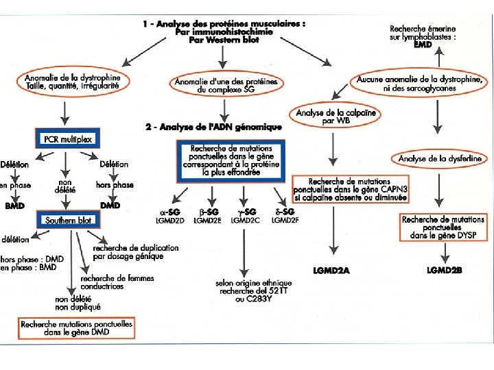 Démarche diagnostic: les examen complémentaires Investigation certifiant la diagnostic: La biopsie musculaire: Morphologie: taille de fibres, nécrose- régénération, centralisation nucléaire, inflammation vacuoles, etc. Immunocytochimie: recherche d’une protéine qui manque Western Blot
