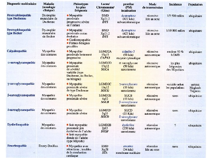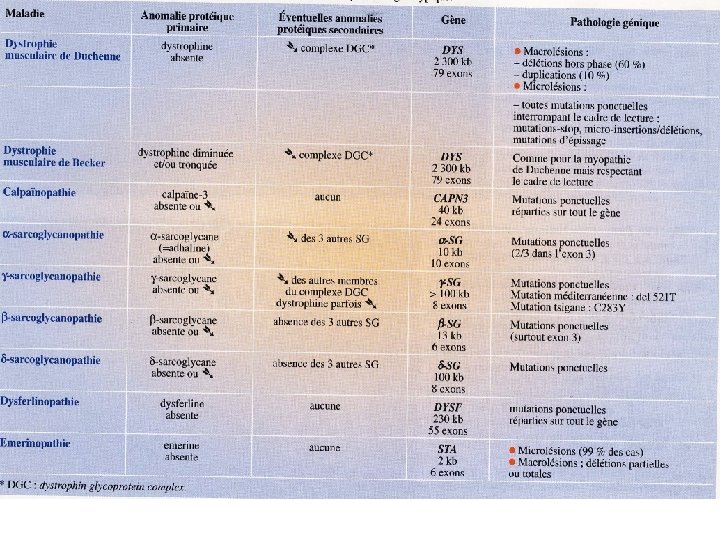 Démarche diagnostic: les examen complémentaires Investigation certifiant la diagnostic: Caractérisation de l’anomalie génétique D’emblée sans biopsie: Steinert, myopathie FSH, myopathie oculopharyngée Autres dystrophies et myopathies: seulement après caractérisation de la protéine ou de l’enzyme manquant La caractérisation de l’anomalie génétique est faite sur SANG. Elle est faite sur MUSCLE dans des cas particuliers: - Pour recherche de mutation dans ADN mitochondriale - Pour recherche de mutation spécifiques que ne peuvent pas être vues dans le sang (ex. mutation des sites d’épissage) - Si c’est le seul tissu disponible