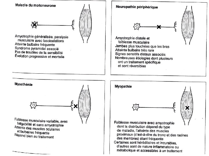 Démarche diagnostic: interroger le patient 2. Profil chronologique: -Age du début (congénitale, enfance, adulte, âge avancée) -Évolution (rapide DMD, lente DC, par poussés MG) 3. Antécédent familiaux: - Arbre généalogique [pathologie héréditaire , type de hérédité (DOM, REC, Lié à X, Mitochondriale)] NDR. Ne pas négliger les formes plus discrètes, autres pathologies qui pourraient avoir un rapport avec une affection musculaire (ex Mort fœtale, mort subite, cardiopathie, cataracte: Dystrophie de Steinert). 4. Recherche d’un contexte: - générale (asthénie, fébricule, amaigrissement, arthrite, éruption) - inflammatoire ou infectieux - endocrinien (ex. thyroïde) - toxique (alcool, héroïne, cocaïne etc. ) ou iatrogène(ex. hypocholestérolémiants, corticoïdes, AZT)