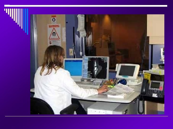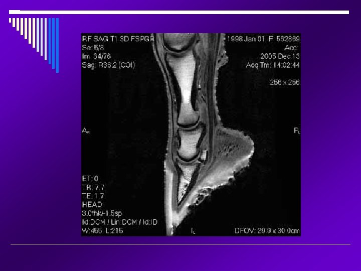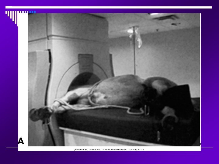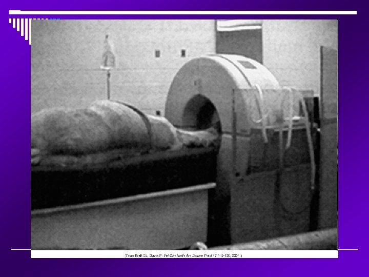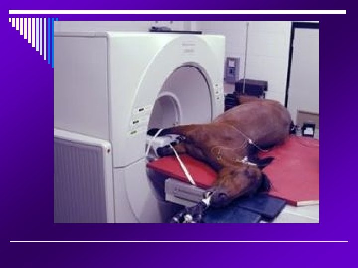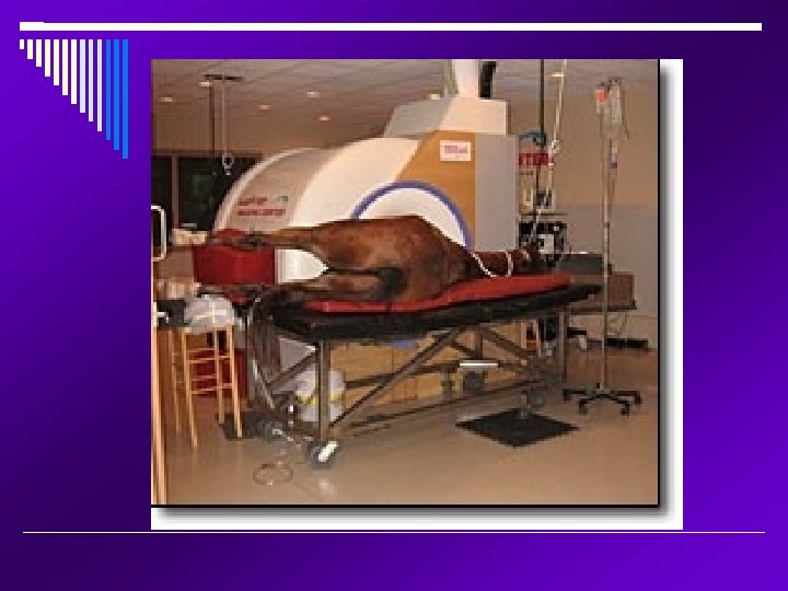 MRI Magnetic Resonance Imaging; the area being imaged is placed within a strong magnetic field and stimulated by radio-frequency pulses. These radio-frequency signals are collected analyzed by computers to form the image. Very, very costly and not widely available Anesthesia is required MRI tend to be superior to CT for soft tissue imaging The head, cervical spinal cord and lower legs can be imaged in an adult animal Precise and focal imaging tool that produces images of all tissue types; bone, tendons, ligaments, and fluid. Mainly utilized in equine lameness.