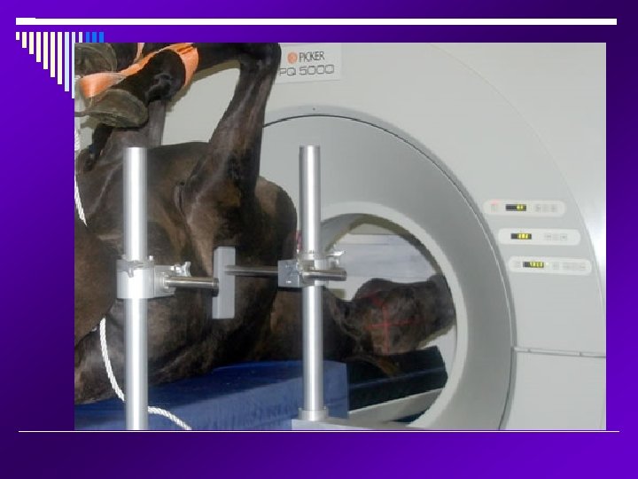CT or CAT Scan Computed tomography has just recently become available for large animal patients. This equipment is very expensive and limited to specialized facilities. Use is restricted in adult horses to the examination of the head, cranial cervical spine and distal limbs. Patient must be under anesthesia. Must be injected with radioisotope and is absorbed by bony areas Used as a last resort in diagnosing.