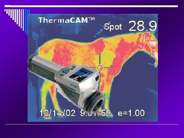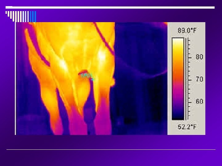 Thermography Uses a heat camera to scan the body surface temperature of the patient. Very popular because it is non-invasive, equipment is affordable and portable. Primarily used to locate “hot spots” which may indicate inflammation near the body surface. Deeper locations can not be detected, such as within the thorax or abdomen.