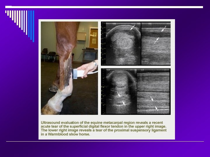 Common uses of Ultrasound Visualize kidneys and capable of ultrasound guided biopsy Lungs for pneumonia diagnosis and treatment GI for colics - small intestinal distension, large colon wall thickness, peritoneal fluid, diagnosis of abcesses and tumors Foals - GI disease, umbilical structures (diagnose umbilical infections), ruptured bladder Liver - ultrasound guided biopsy Assist with lameness diagnosis, including the extent of tendon and ligament damage Eyes