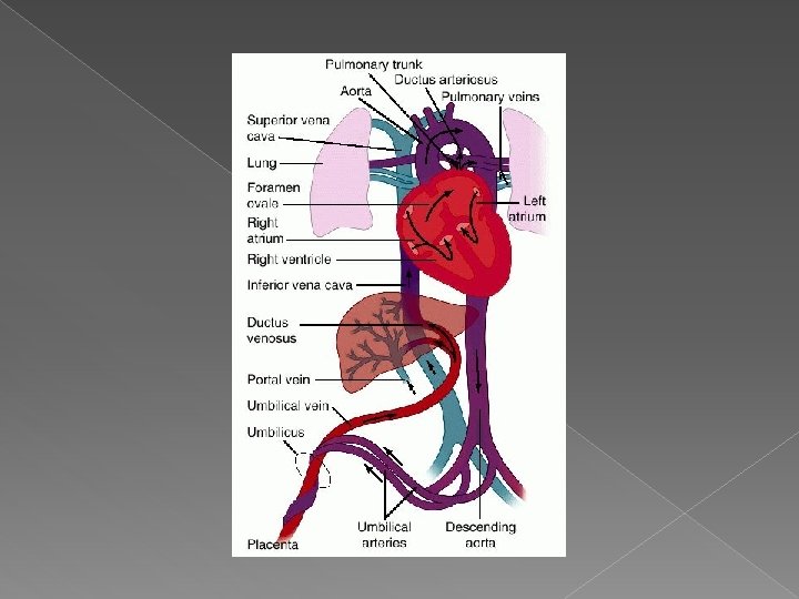 Fetal circulation Oxygenated blood enters the fetus through the umbilical vein � The ductus venosus partially bypasses the lever to send oxygen – rich blood to the right ventricle � The foramen ovale shunts some of the right atrial blood directly into the left atrium � The ductus arteriosus allows oxygen-rich blood from the pulmonary artery into the aortic arch to circulate throughout the fetus �
