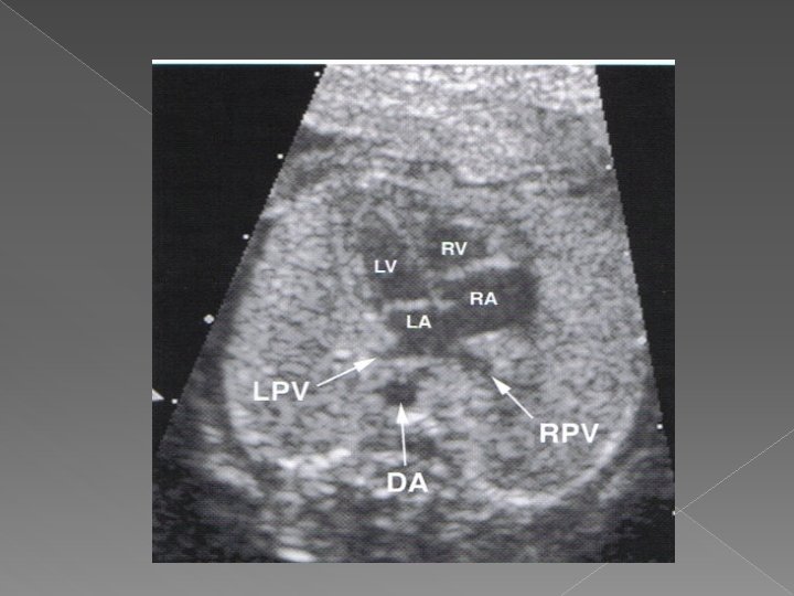 � Normal cardiac study checklist: › 4 chamber view, right ventricle has moderator band, left atria: can visualize pulmonary veins, and between the atria you must see the space for the foramen ovale which closes after birth › RVOT – RV to pulmonary artery and the bifurcation. The ventricles must cross each other › LVOT – LV to the aorta, must show with and without valve › Aortic arch with the 3 branches (right brachio-cephalic, left CCA, and the left subclavian artery) › Septum – measurement should be s/b <4 mm. the septum has 2 parts – PRIMA and SECONDUM, if the secondum is missing, the base at the atrium will look flat › Pulmonary artery (bifurcation) › Ductal arch (looks like golf club, whereas the aortic arch has more of a candy cane shape)