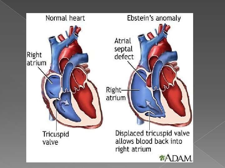 Ebstein's anomaly is a congenital heart defect in which the opening of the tricuspid valve is displaced towards the apex of the right ventricle of the heart. � This causes the right atrium to be large and the anatomic right ventricle to be small in size. � There may be an increased risk of this abnormality in infants of women taking lithium during the first trimester of pregnancy � While Ebstein's anomaly is defined as the congenital displacement of the tricuspid valve towards the apex of the right ventricle, it is often associated with other abnormalities �