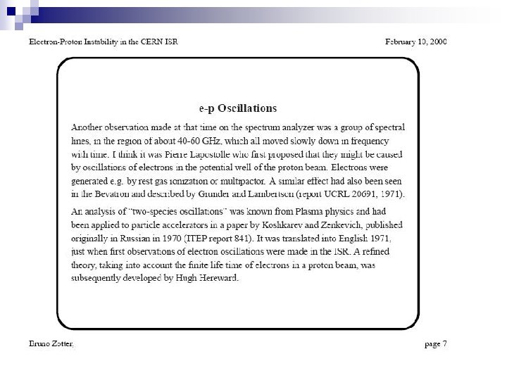 References for first observation of e-p instability n n n n n V. Dudnikov, “The intense proton beam accumulation in storage ring by chargeexchange injection method”, Ph. D. Thesis, Novosibirsk INP, 1966. G. Budker, G. Dimov, V. Dudnikov, “Experiments on production of intense proton beam by charge exchange injection method” in Proceedings of International Symposium on Electron and Positron Storage Ring, France, Sakley, 1966, rep. VIII, 6. 1 (1966). G. Budker, G. Dimov, V. Dudnikov, “Experimental investigation of the intense proton beam accumulation in storage ring by charge- exchange injection method”, Soviet Atomic Energy, 22, 384 (1967). G. Budker, G. Dimov, V. Dudnikov, V. Shamovsky, “Experiments on electron compensation of proton beam in ring accelerator”, Proc. VI Intern. Conf. On High energy accelerators, 1967, MIT & HU, A-104, CEAL-2000, (1967). G. I. Dimov, V. G. Dudnikov, V. G. Shamovsky, ” Transverse instability of a proton beam due to coherent interaction with a plasma in a circular accelerator” Soviet Conference on Charge- particle accelerators”, Moscow, 1968, translation from Russian, 1 1973 108565 8. G. Dimov, V. Dudnikov, V. Shamovsky, “Investigation of the secondary charged particles influence on the proton beam dynamic in betatron mode ”, Soviet Atomic Energy, 29, 353 (1969). Yu. Belchenko, G. Budker, G. Dimov, V. Dudnikov, et al. X PAC, 1977. O. Grobner, X PAC, 1977. E. Colton, D. Nuffer, G. Swain, R. Macek, et al. , Particle Accelerators, 23, 133 (1988).