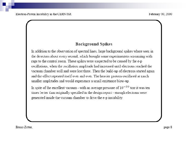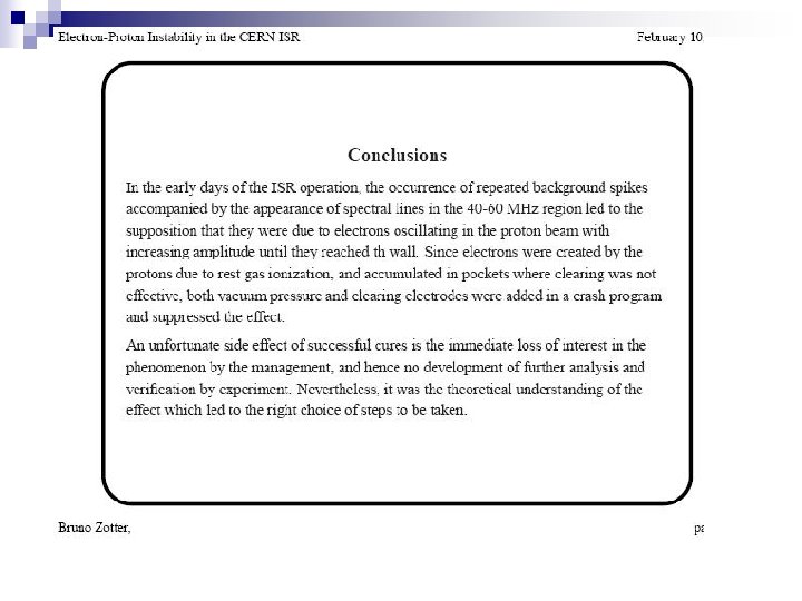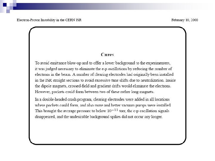 ISR, coasting proton beam, ~1972 (R. Calder, E. Fischer, O. Grobner, E. Jones) excitation of nonlinear resonances; gradual beam blow up similar to multiple scattering beam induced signal from a pick up showing coupled e-p oscillation; beam current is 12 A and beam energy 26 Ge. V 2 x 10 -11 Torr, 3. 5% neutralization, DQ=0. 015 • Damped by extensive system of electrostatic clearing electrodes