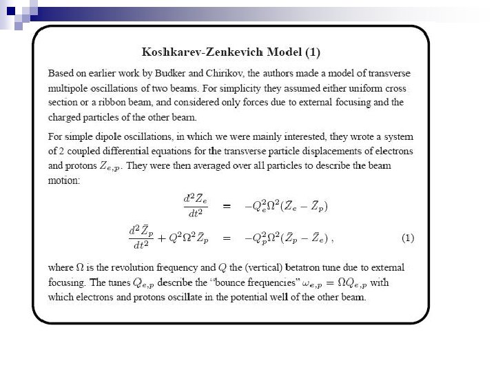 Models of two-stream instability n n n 1. 2. 3. 4. 5. 6. The beam- induces electron cloud buildup and development of two-stream e-p instability is one of major concern for all projects with high beam intensity and brightness [1, 2]. In the discussing models of e-p instability, transverse beam oscillations is excited by relative coherent oscillation of beam particles (protons, ions, electrons) and compensating particles (electrons, ions) [3, 4, 5]. For instability a bounce frequency of electron’s oscillation in potential of proton’s beam should be close to any mode of betatron frequency of beam in the laboratory frame. http: //wwwslap. cern. ch/collective/electron-cloud/. http: //conference. kek. jp/two-stream/. G. I. Budker, Sov. Atomic Energy, 5, 9, (1956). B. V. Chirikov, Sov. Atomic. Energy, 19(3), 239, (1965). Koshkarev, Zenkevich, Particle Accelerators, (1971). M. Giovannozzi, E. Metral, G. Rumolo, and F. Zimmerman , Phys. Rev. ST-Accel. Beams, 6, 010101, (2003).