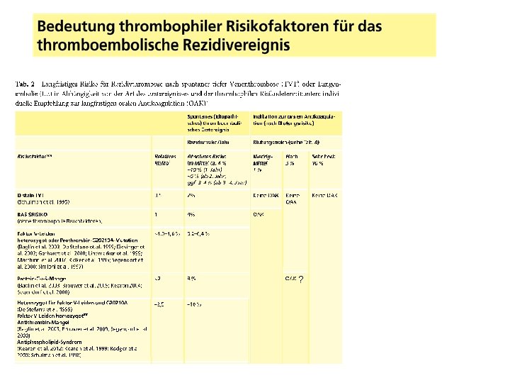 Risikostratifizierung nach Rezidivrisiko: Relatives Risiko Distale TVT 0, 5 Negative D-Dimere 1 Mo nach OAK 0, 4 Basisrisiko 1 Rezidiv TVT/PE 1, 5 Residuelle Thrombose 1, 5 Männliches Geschlecht 1, 6 Niedrig Risikogruppe müsste Rezidivrisiko < 3%/a Niedrigstes Blutungsrisiko: < 25% in 8 Jahren 8%-8 a klarer Benefit: Absetzten Hoch Risikogruppe müsste Rezidivrisiko > 9%/a höchstes Blutungsrisiko: > 75%% in 8 Jahren 24%-8 a klarer Benefit: unbegrenzte Antikoagulation Prolong Studie: Patienten mit neg. D. Dimer nach OAK Rezidivrisiko 4, 4%/a